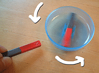 今回のセットに入っている「うき」という青い容器に 棒じしゃくをセットして、もう一個の棒じしゃくを近づけてみよう。
