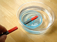 それじゃ、ついでに水に浮いた自由度の高いじしゃくに、 まずはS極にN極を近づけてみると・・