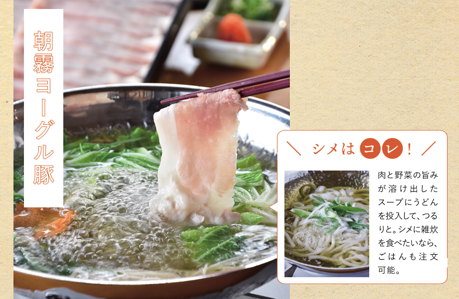 「ふじしげ」のメニューに並ぶ豚肉料理は、すべて富士宮特産の「朝霧ヨーグル豚」。独自技術によるヨーグルト状の飼料で育つブランド豚は、肉質が柔らかく旨みがあり、あっさりとした味わいが特徴。昆布とカツオの出汁にさっとくぐらせ、お好みでポン酢か胡麻ダレでいただこう。