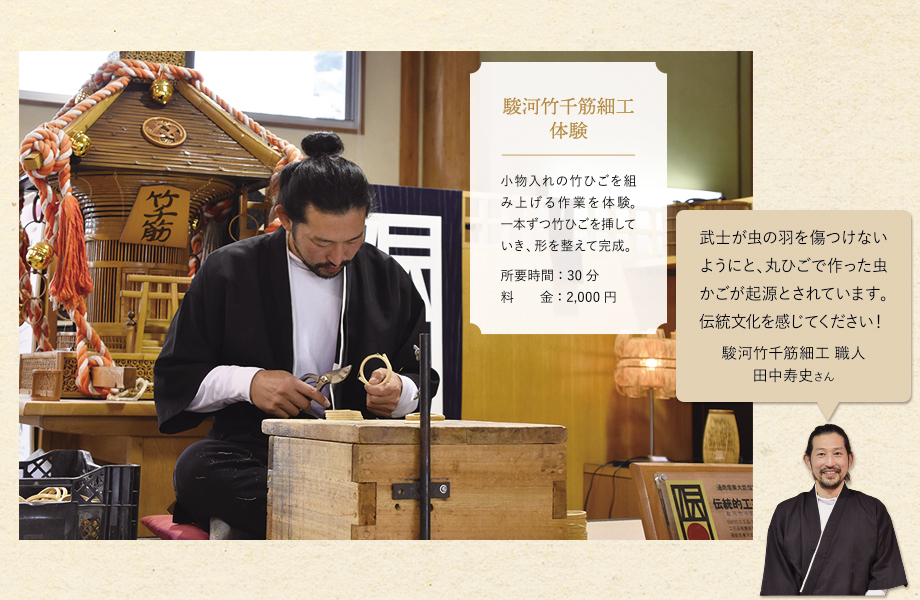 全国に数ある竹細工のなかでも、細く削った竹ひごを使うのは静岡の「駿河竹千筋細工(するがたけせんすじざいく)」のみ。何筋もの竹ひごが作り出す、繊細で美しい造形が魅力だ。竹枠やひごなど職人の手で一つひとつ作られた材料を使って、仕上げの組み上げる段階に挑戦してみよう。匠宿では、ほかにも染物や木工などさまざまな静岡伝統の技術を体験できる。